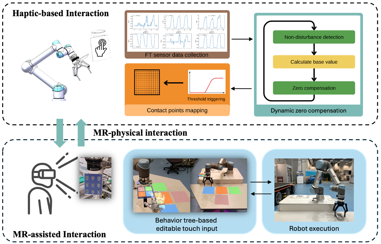 A haptic-enhanced interaction approach for MR-assisted HRC, integrating interchangeable touch boards with editable virtual panels and force-torque-based tactile analysis for intuitive robot control.